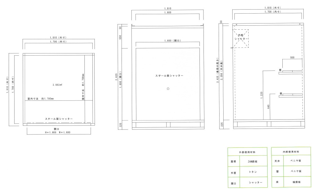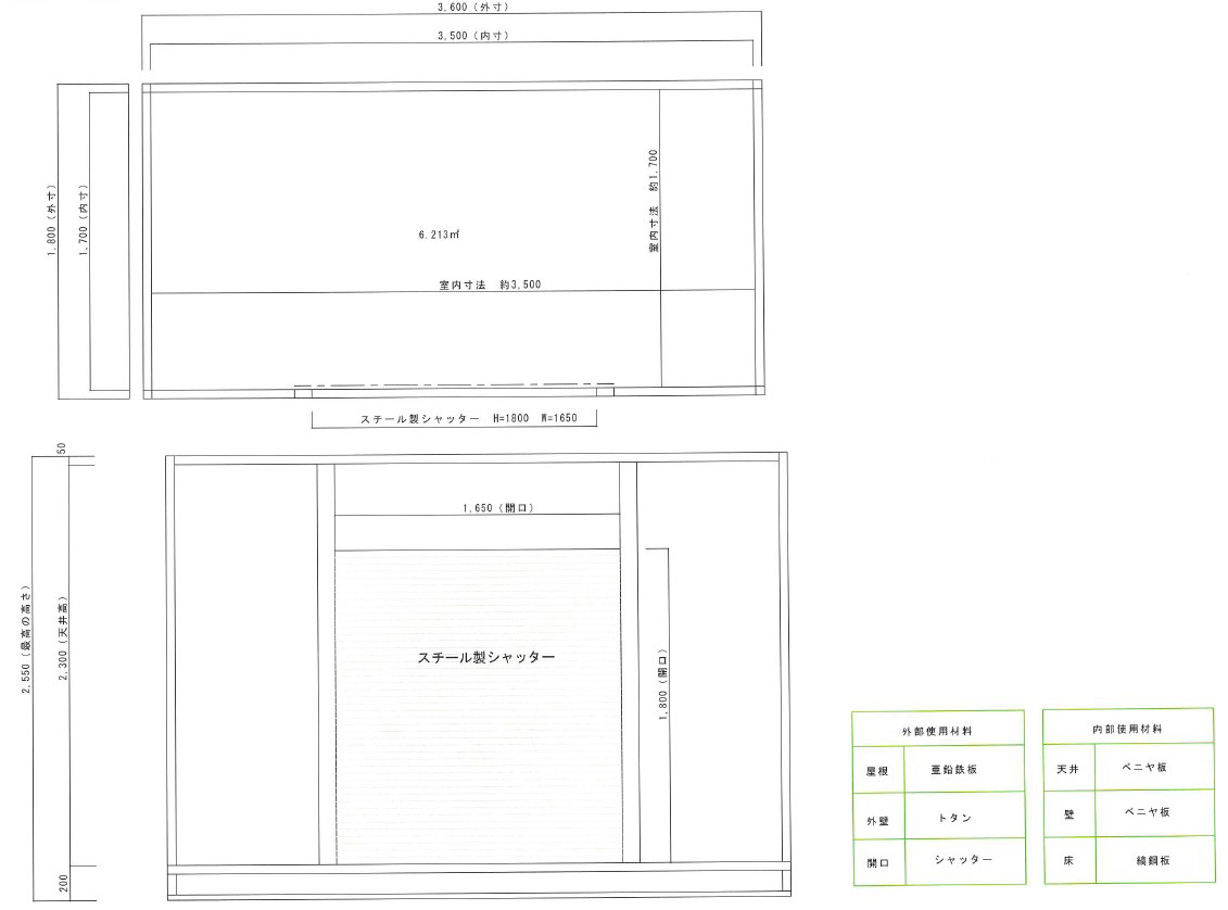 シャッター・カギ付き。 【外部使用材料】屋根:トタン 外壁:トタン 【内部使用材料】天井:ベニヤ板 壁:ベニヤ板 床:縞鋼板 |