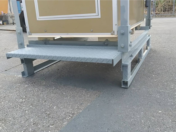 コンクリートの地面にアンカーボルトを打ち込み、仮設トイレの四隅とチェーンで繋ぎ固定します。
